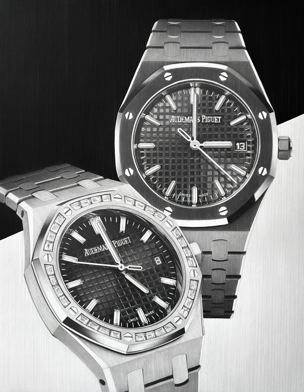 This drawing is part of a series of two. It features two Audemars Piguet Royal Oaks: a black ceramic and a stainless steel with diamonds. The composition highlights the interplay between the watches, emphasizing similarities, contrasts, and rhythm across dials, bezels, and bracelets.