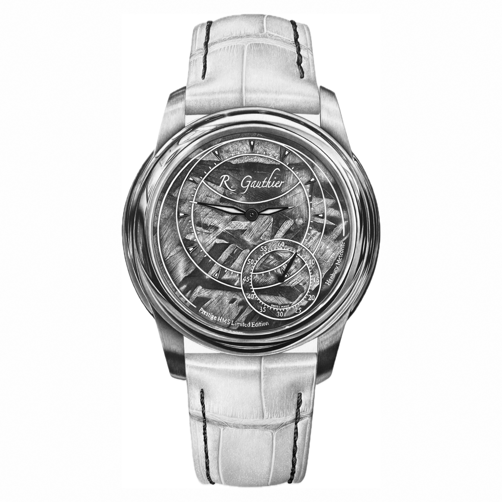 This drawing features the R. Gauthier HMS Prestige with a meteorite dial and white leather strap. The composition emphasizes texture and subtle light shifts, capturing the quiet shimmer and irregularities of the dial while maintaining the clarity of the strap.