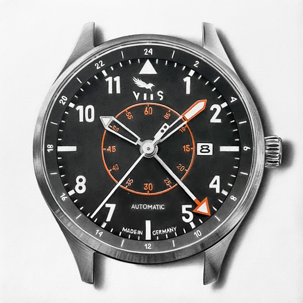 This drawing features the newly launched VIIS Flieger GMT. Dark dials are deceptively challenging, and the piece focuses on subtle tonal shifts, careful highlights, and controlled contrast to maintain depth and dimensionality.