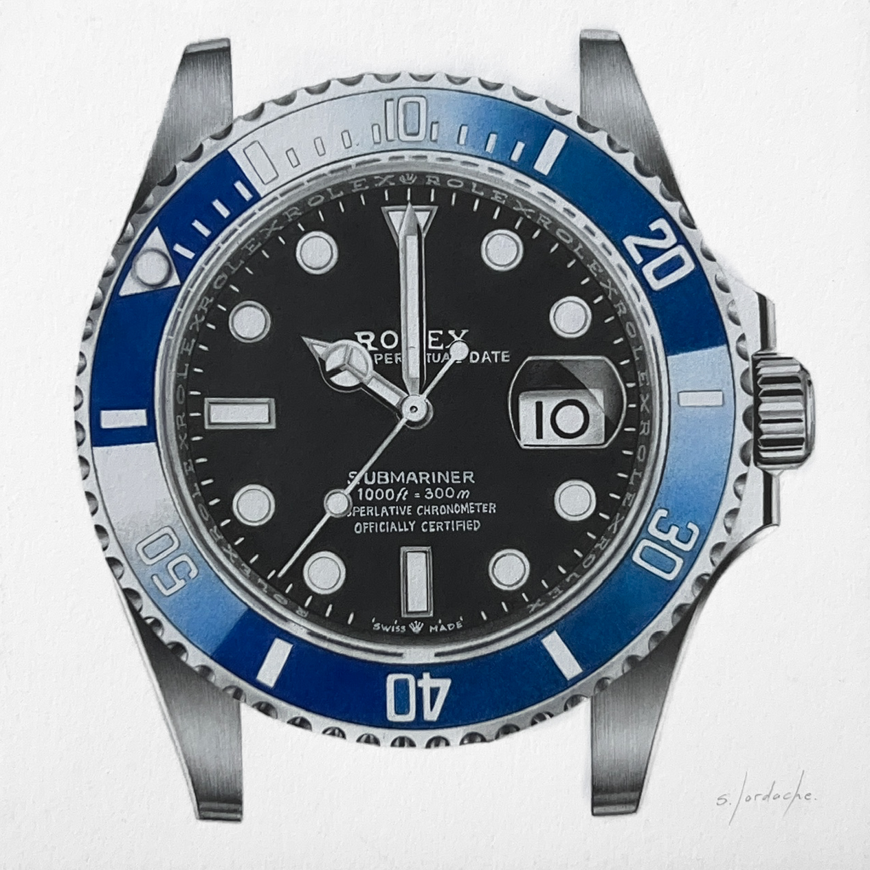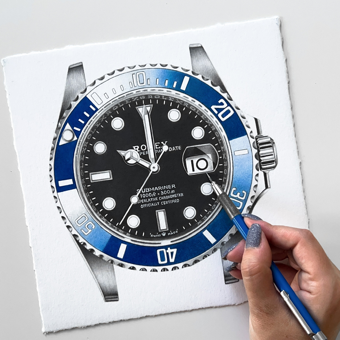 A 8″ x 8″ (20 x 20 cm) custom colour watch drawing of your chosen watch case and dial (no strap or bracelet).